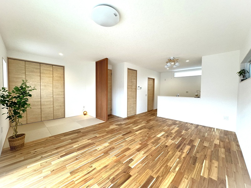 LDKに畳コーナーが続く広々空間。格子が緩やかに空間を仕切ります♪