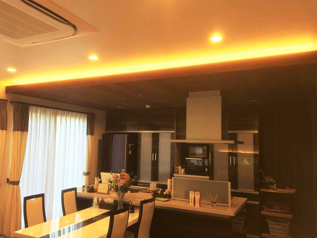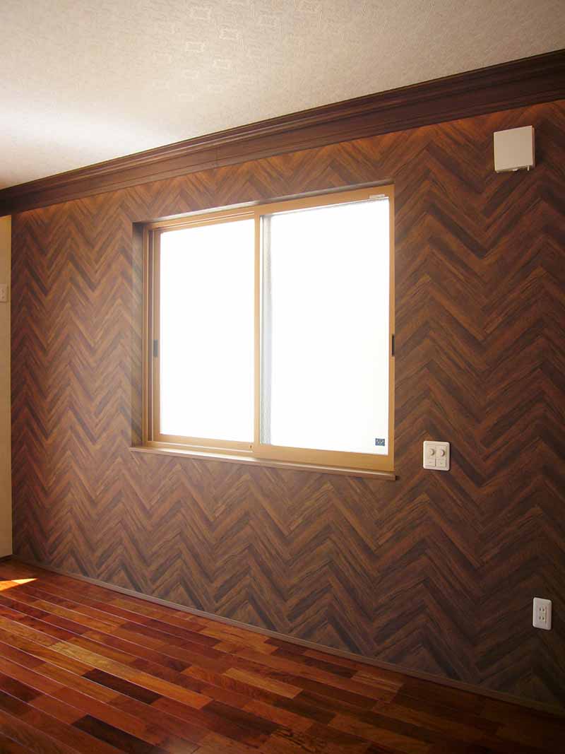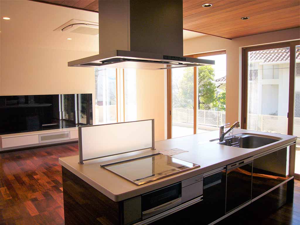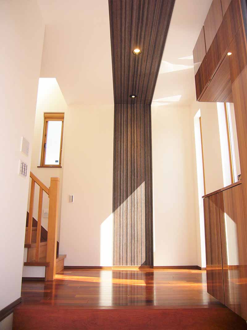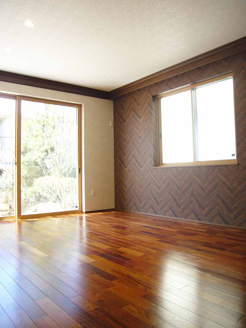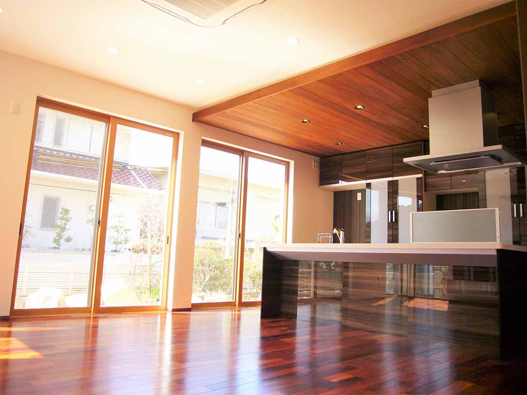 光沢深みのある無垢の床材や板張り天井、鏡面の住宅設備が高級感を演出。