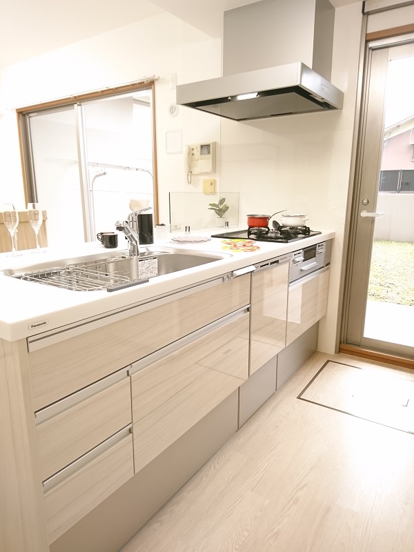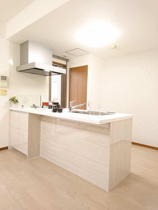 奥様こだわりのキッチンは、元々設置されていた吊り戸棚を撤去し、明るい光が入り込むオープンキッチンに。