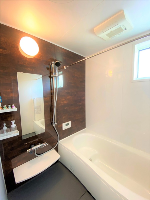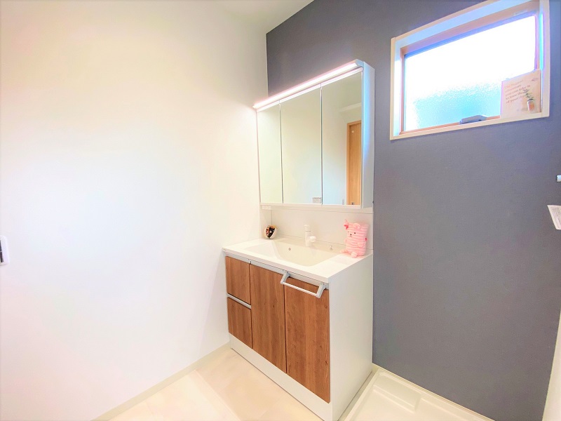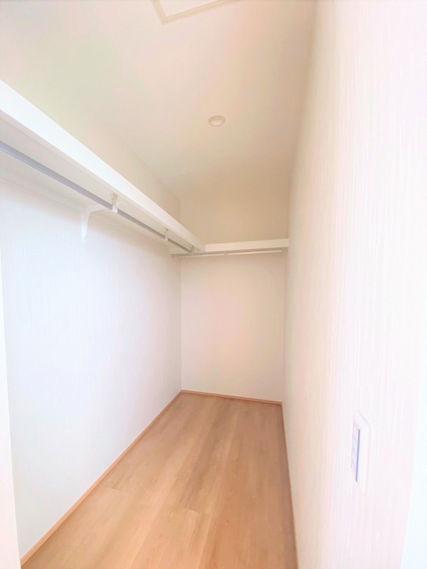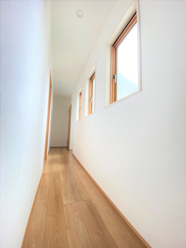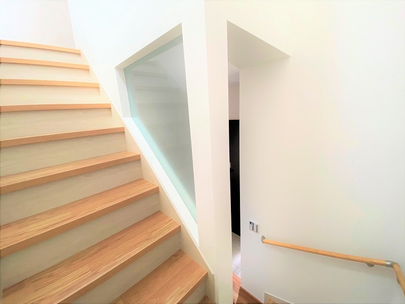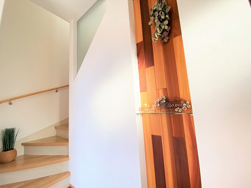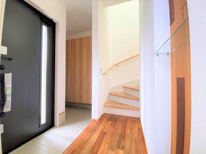 外で使用する道具の収納に便利なシューズクロークと玄関正面に板貼りのニッチを付け、お洒落で実用性のある空間に仕上げました。