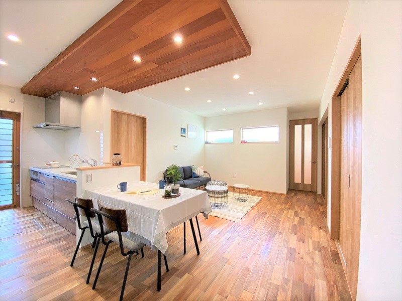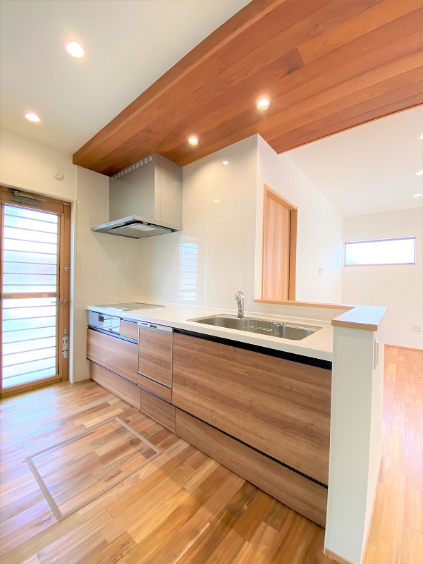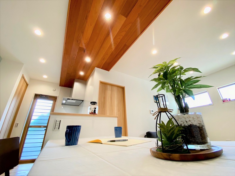 キッチン上部は「無垢板貼り天井」仕上げ。木の心地よさと美しさが特徴。