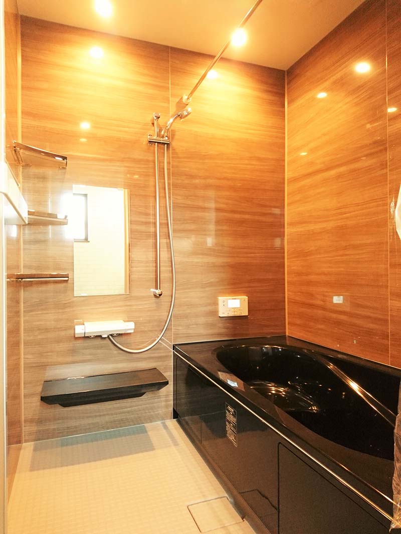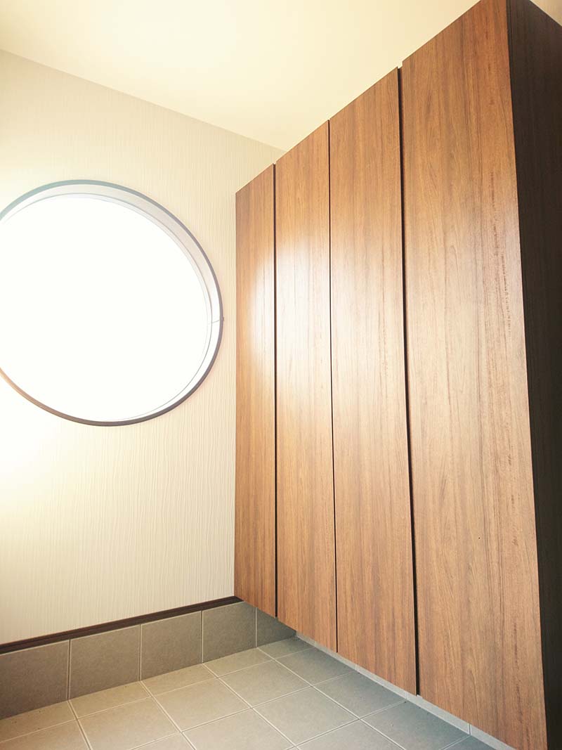 全面を木目柄で仕上げ、高級感の増した浴室や個性あふれるひのき丸太柄のクロスが目を引く玄関や丸窓は施主様こだわりの空間となっています。