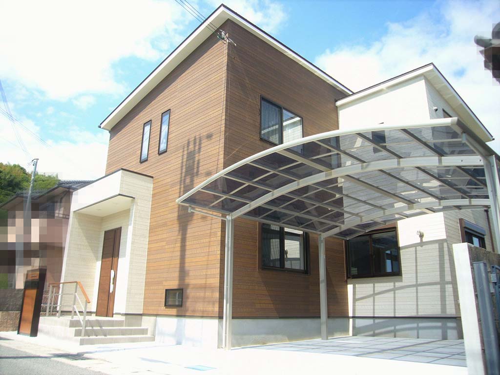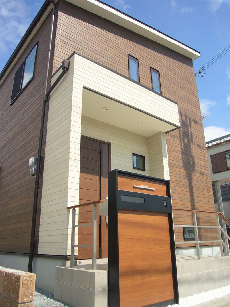 シンプルな片流れ屋根のシルエットがおしゃれな総木目柄の外観。