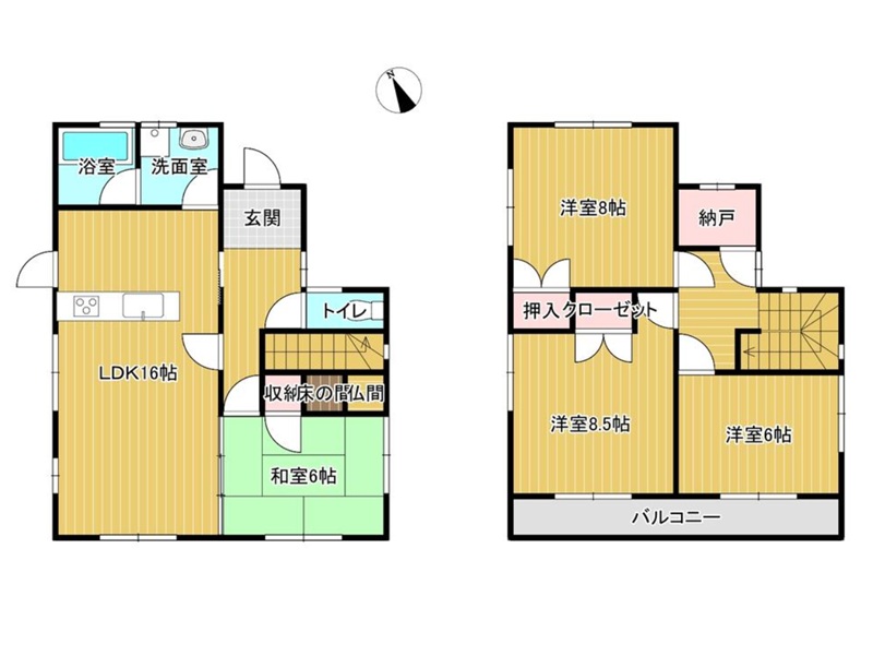 洋室8.5畳 2階 1室 洋室8.0畳 2階 1室 洋室6.0畳 2階 1室 和室6.0畳 1階 1室 LDK16畳 1階 1室 納戸あり |